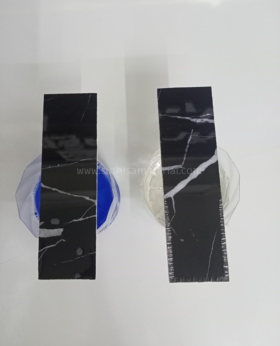 จากการทดลองแช่แผ่นพีวีซีลายหินลงในน้ำยาล้างห้องน้ำ 30 นาที แผ่นพีวีซีลายหินสามารถทนการกัดกร่อนของน้ำยาล้างห้องน้ำได้ สามารถใช้น้ำยาล้างห้องน้ำทำความสะอาดแผ่นพีวีซีลายหินได้ปกติ แผ่นพีวีซีลายหิน ไม่ลอก ไม่เป็นรอย