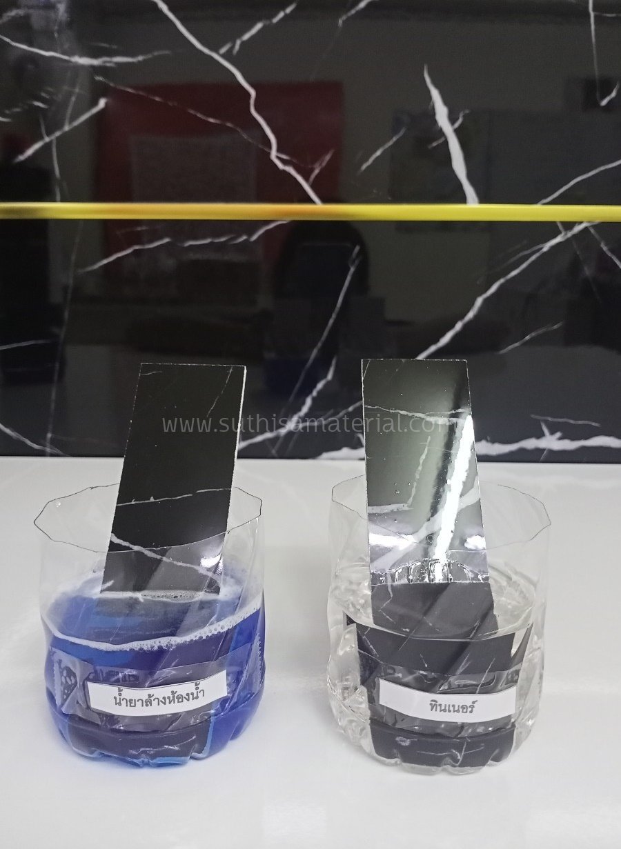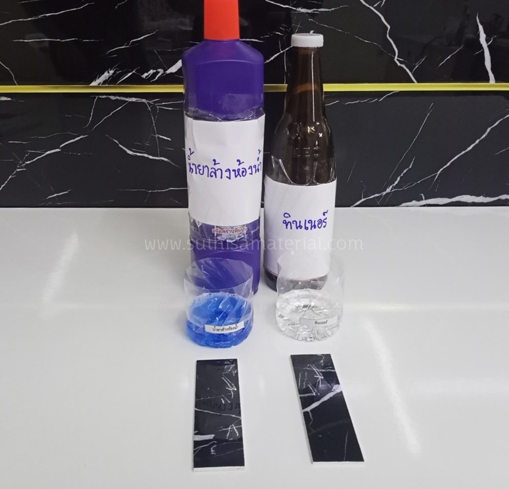 ทดสอบแผ่นพีวีซีลายหินด้วยน้ำยาล้างห้องน้ำและทินเนอร์