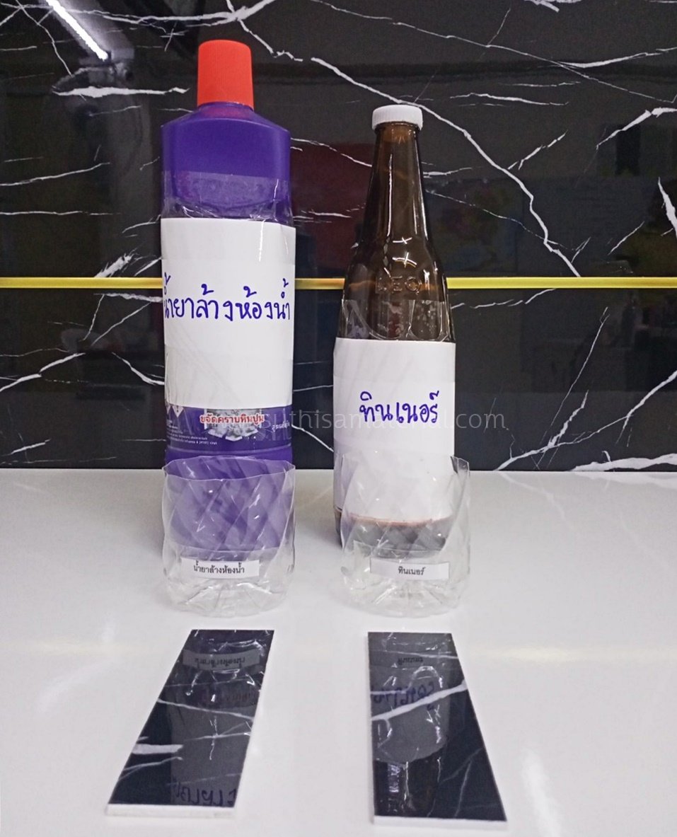 2. เทน้ำยาล้างห้องน้ำใส่แก้วพลาสติกที่เตรียมไว้ เททินเนอร์ใส่แก้วพลาสติกที่เตรียมไว้ (ในปริมาณที่เท่ากัน)
