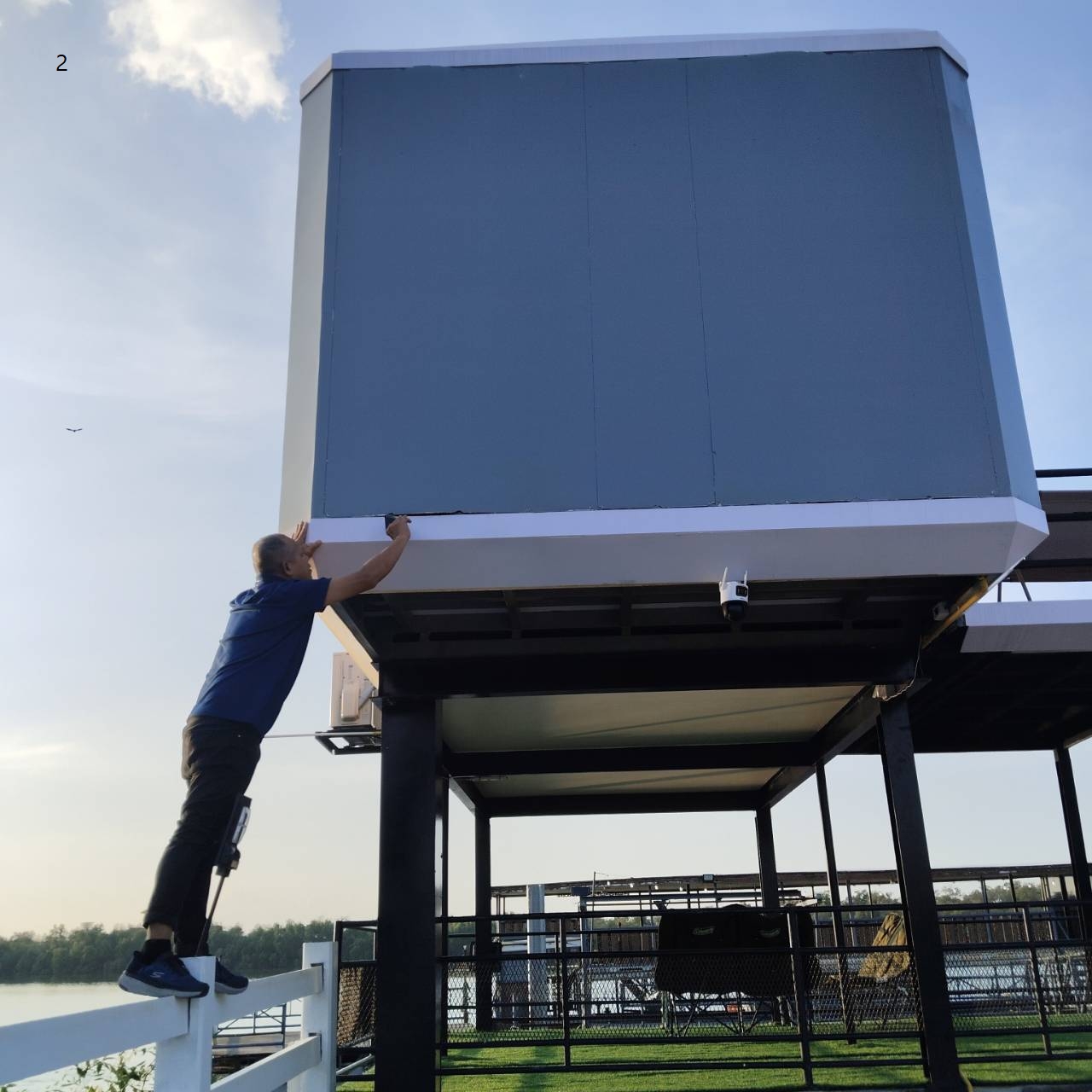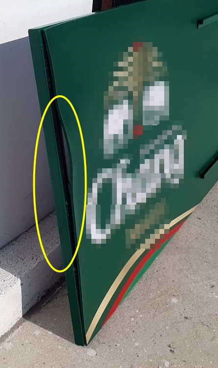 ตัวอย่างพลาสวูดติดสติ๊กเกอร์สีเข้มโดนแดดโดยตรงเกิดการบิดตัวของพลาสวูด