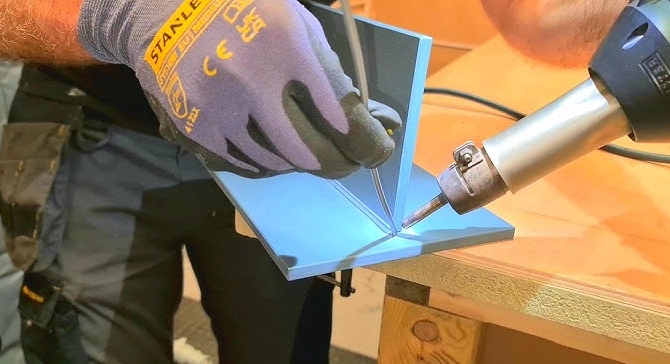 ใช้เครื่องเชื่อมพีวีซี: เปิดเครื่องเชื่อมพีวีซีและตั้งอุณหภูมิให้เหมาะสม (ปกติจะอยู่ที่ประมาณ 250-300 องศาเซลเซียส ขึ้นอยู่กับประเภทของพีวีซีที่ใช้)