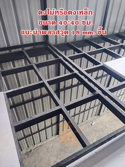 เริ่มต้นด้วยการทำโครงสร้างรองรับ แผ่นพลาสวูดปูพื้น โดยใช้เหล็กกล่องขนาด 3x1.5 นิ้ว วางเป็นตารางระยะห่าง 40x40 ซม.