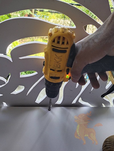 เมื่อได้ขนาดพอดี ให้นำ แผ่นพลาสวูดยิงสกรู ยึดลงบนโครงเหล็กทุกจุดที่มีรอยต่อ