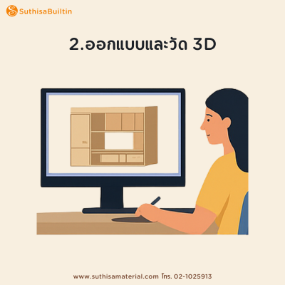 นักออกแบบจะนำขนาดจริงมาทำแบบ 2D/3D เพื่อให้เห็นภาพรวม ทั้งสไตล์ สี วัสดุ และฟังก์ชันการใช้งาน ลูกค้าสามารถแก้ไขหรือปรับดีไซน์ได้ก่อนเข้าสู่การผลิต
