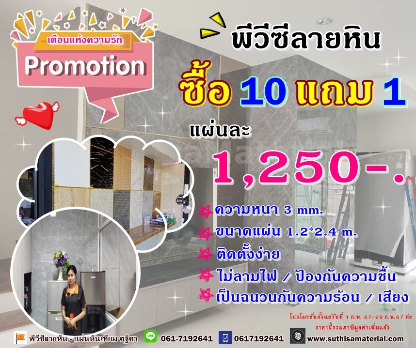 ลูกค้าท่านใดสนใจวัสดุตกแต่งภายใน เพิ่มความสวยงาม หรูหรา ให้กับผนังบ้าน รีบจับจองกันได้เลยนะคะ โปรโมชั่นดีๆ ของเดือนแห่งความรักซื้อ 10 แถม 1 สินค้าแน่นๆ สต็อกพร้อมจัดส่งค่ะ